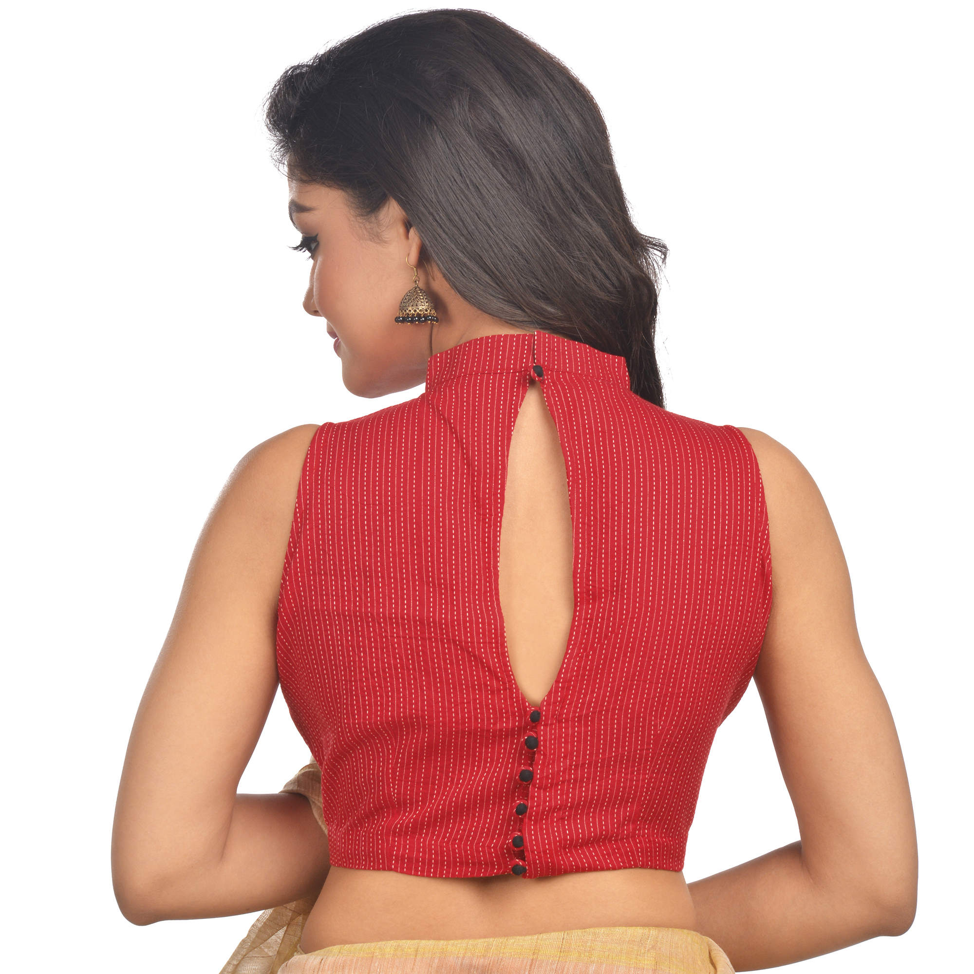 This Red Blouse has Cotton Fabric, stand collar, back slit, sleeveless. You can team it up with a solid colour saree. Care: Wash separately in cold water; do not bleach; dry in shade; medium to hot iron.